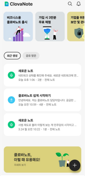 클로바노트 앱을 실행하고 우측 하단 플러스 아이콘을 클릭합니다.